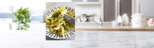 Ingredients 4 cups cooked penne pasta, warmed up 0.75 oz. bunch of basil leaves 1 tbsp. pine nuts 2 garlic cloves, peeled 2 tbsp. parmesan cheese, grated 1/3 cup olive...