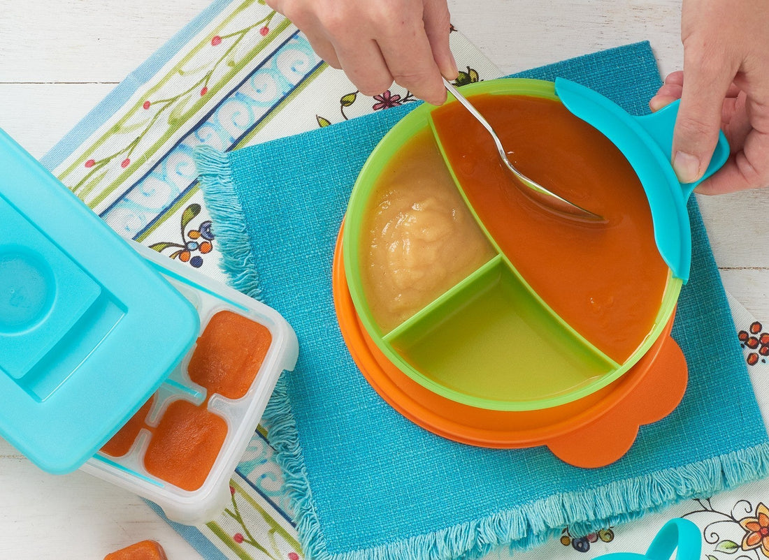 - Añade 1 cucharada más de agua según sea necesario. En cada cubo de la bandeja de hielo Fresh & Pure , añade 1 cucharada (15 g/½ oz) del puré.