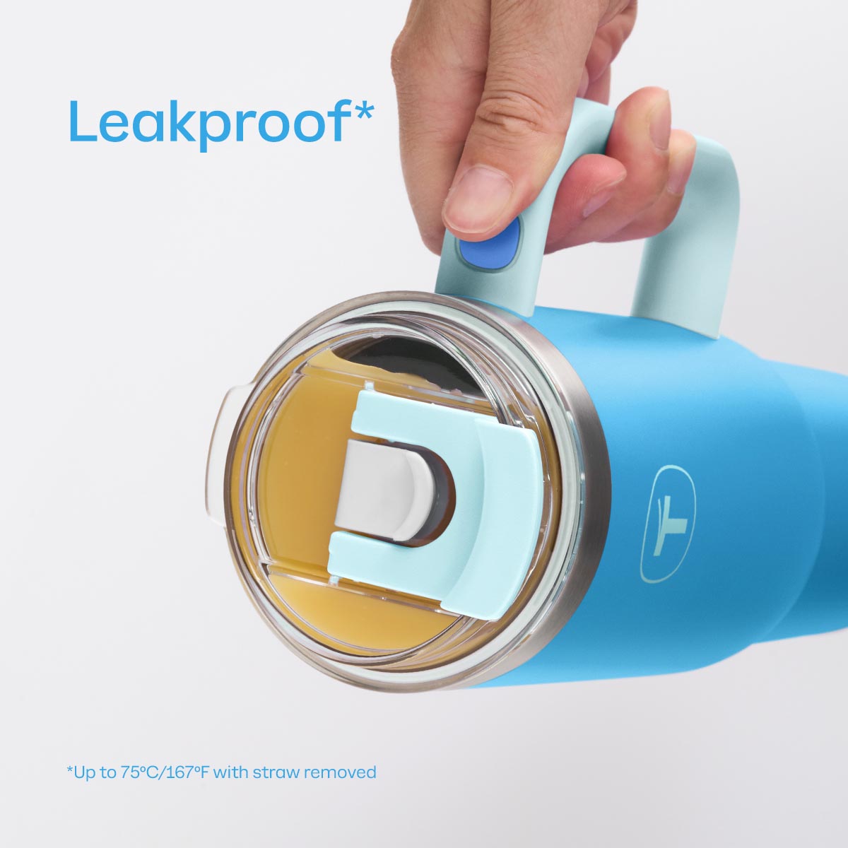 Evita ponerle bebidas de más de 167 °F / 75 °C si piensas usarlo con la tapa puesta para prevenir fugas y quemaduras. Puedes ponerle líquidos más calientes, pero sin la tapa.
